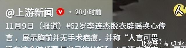 在视频中,李连杰选择“坦诚相待”,脱去了上衣,胸前并没有任何手术留下来疤痕的印记,疑似是在辟谣网上关于他“换心”的传闻。